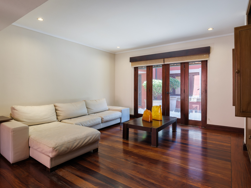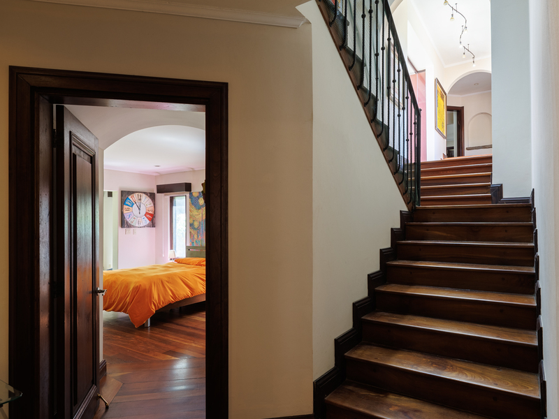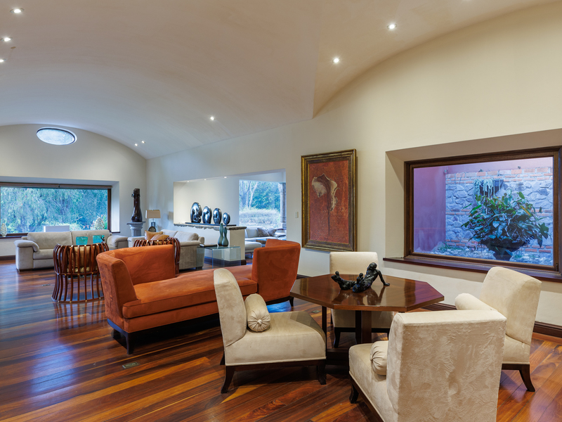 The architectural design pays homage to timeless Spanish colonial tradition, featuring terracotta roof tiles, vaulted ceilings, and artisan-crafted finishes throughout. Interiors flow effortlessly through a central courtyard and elegant hallways finished with stone, wood, and ironwork, each space revealing meticulous craftsmanship. The villa's main living areas are bright and open, framed by floor to ceiling windows and doors that invite nature inward. Wide corridors and gallery-style walls serve as the perfect canvas for a curated art collection, while warm hardwood floors and exposed beams create an atmosphere of elegance and comfort.