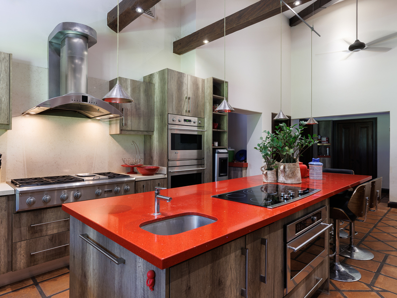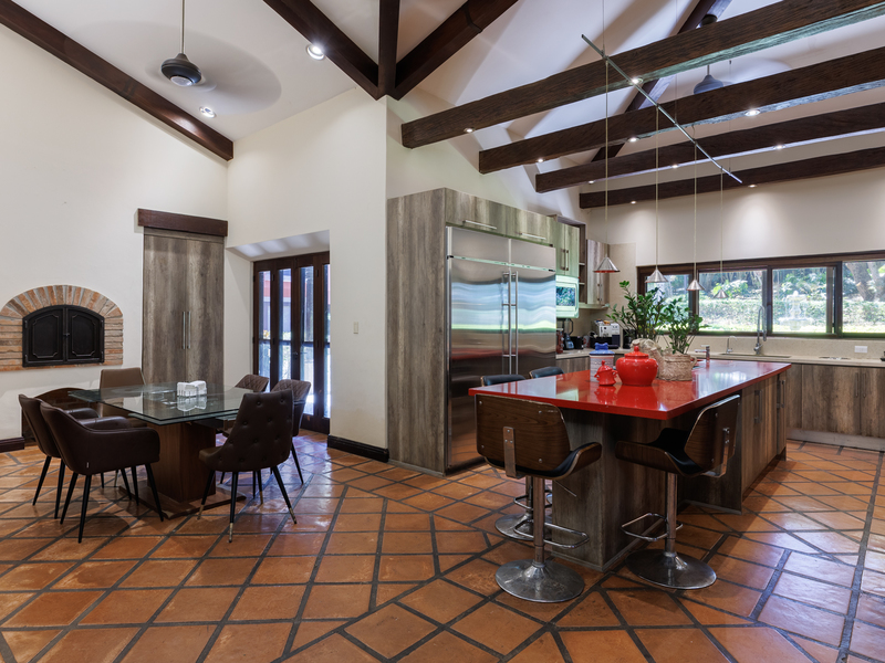 The gourmet kitchen with an incorporated large breakfast area, blends rustic textures with contemporary utility, featuring wood cabinetry, granite countertops, a large island, and high-end appliances. Ideal for both family gatherings and entertaining, the kitchen is connected to the elegant formal dining area with gigantic windows and tranquil garden views.